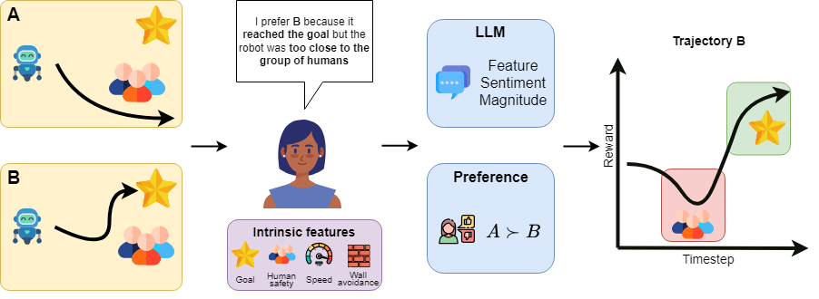 This paper aims to utilize the zero-shot capabilities of LLM in order to increase the granularity of preference-based feedback by extending my previous work. By letting the user give optional auxiliary textual descriptions of their preference we ensure that the reward function align with what the human actually wants as well as improve the sample-efficiency by avoiding over-sampling.