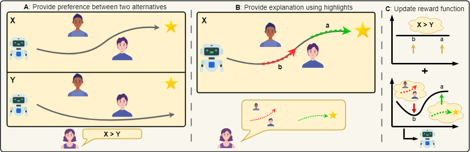 This paper aims to improve the granularity of preference-based feedback by adding temporal trajectory segmentation to highlight positive and negative parts. This helps avoid the uniform assignment of responsibility across the whole trajectory while it might just be some part that was actually preferred. The highlights are then optimized as an auxiliary task ensuring a improved shared representation.