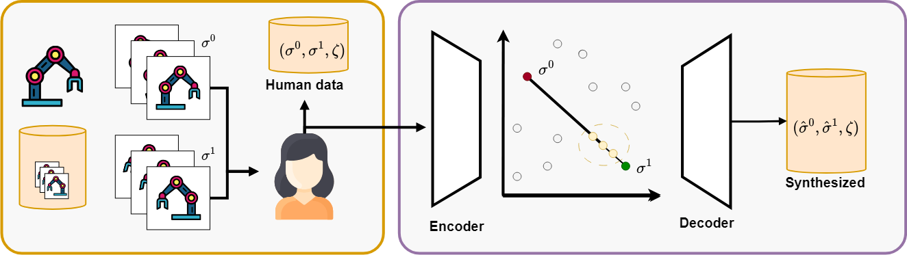 By utilizing semi-supervised learning we can improve the sample-efficiency by augmenting the preferences provided by humans. We train a VAE to learn a latent representation and thereafter synthesise new queries from existing ones by interpolating the trajectory pairs. The idea is that if a user prefers traj A over traj B, even if they are a bit closer (like 10%) they would still prefer it. This helps the feedback generalize better.