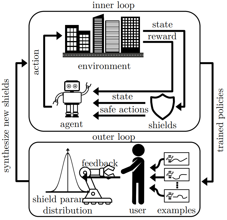 To obtain policies that are perceived as safe, we propose a shield synthesis framework with two distinct loops: (1) an inner loop that trains policies with a set of actions that is constrained by shields whose conservativeness is parameterized, and (2) an outer loop that presents example rollouts of the policy to humans and collects their feedback to update the parameters of the shields in the inner loop.